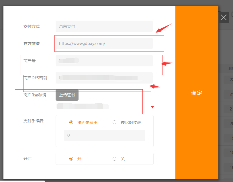 后台-“电子商务设置”-“支付设置”-“京东支付”,点击“编辑”,通过官方链接进行商户账号申请后(注:请选择京东支付)根据京东支付网站中申请提示进行操作,将得到的商户号、密钥等信息填写完全,并上传证书后将其开启,点击保存即可,如图所示: