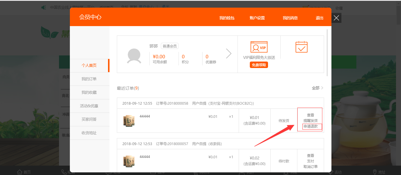 在后台,“电子商务设置”-“交易设置”中,有一个退款的操作,当开启该操作时,在前台用户页面可以直接申请退款,后台消息提醒中也会有相应的提示,点击“查看”即可(注:“退款”默认为关闭状态),如图所示: